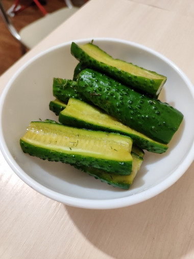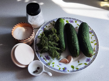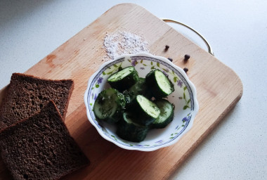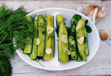 Подзалежались как-то огурчики, решила их засолить. Огурцы нарезала дольками - так всегда делала моя бабушка. Укроп измельчила, чеснок нарезала толстенькими кругляшами. Через четыре часа я получила ароматные, вкусные огурчики, которые вмиг улетели на ужине. Аромат чувствовался даже через пакет. Рекомендую этот рецепт.