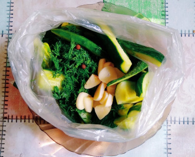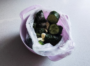 Огурцы тщательно промойте под проточной водой, можете даже потереть их щеткой с содой, чтобы смыть всю грязь. Отрежьте у огурцов кончики. Если у вас маленькие огурцы, то оставьте их как есть. Если же плоды большие, то порежьте их или на четвертинки, или на другое количество кусков. Ориентируйтесь на размер около 7 см. Возьмите чистый крепкий полиэтиленовый пакет подходящего размера. Сложите в него подготовленные огурцы.