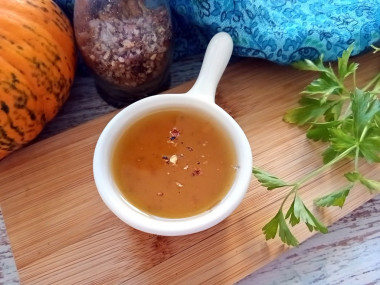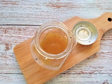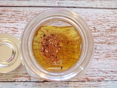 Перелейте масло и уксус в емкость с плотно закрывающейся крышкой. Я использовала бутылочку.