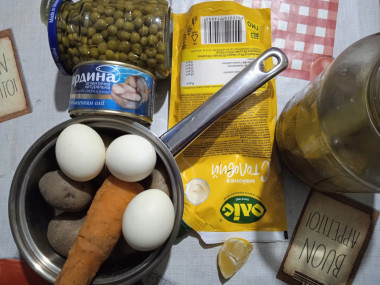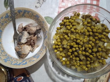 Сделала салат из сайры консервированной с яйцом и горошком по этому рецепту. Только вместо сайры взяла сардину. А также добавила немного отварного картофеля для сытности. Отварила яйца и морковку до готовности. Всё остудила и почистила. Использовала в салате маринованные огурцы и фиолетовый лук. Нарезала все продукты небольшими кубиками, консерву размяла вилкой на кусочки, добавила зелёный горошек. Кусочек лимона порезала очень мелко с кожурой. Заправила салат майонезом и немного поперчила. Получилось оригинально. Салат похож на оливье, только с рыбой. И похож на мимозу, только не слоями. Очень интересный рецепт. Вышло вкусно, ароматно и аппетитно. Кусочки лимона в салате прекрасно подчеркнули вкус сардины. Всё очень гармонично. Замечательный рецепт. Благодарю автора за новинку!