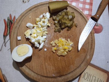 Консервированный огурец нарежьте мелкими кубиками.