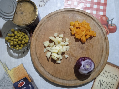 Как сделать салат из консервированной сайры с яйцом, луком и горошком? Подготовьте необходимые ингредиенты. Консервированную рыбу можно взять натуральную или в масле. Репчатый лук подойдет как красный, так и белый. Зеленый горошек достаньте из банки, отделяя от маринада.