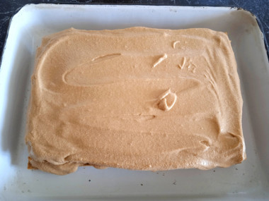 Приготовила крем для торта с вареной сгущенкой и маслом по этому рецепту. Очень простое приготовление вкуснейшего крема. Мягкое масло взбила по описанию в рецепте. Понемногу добавляя варёную сгущёнку, взбивала массу до однородности с помощью миксера на максимальной мощности. Смазала свой тортик кремом и убрала на пропитку.