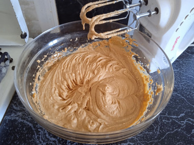 В готовый крем влейте коньяк и взбивайте еще 20 секунд на средней скорости. Коньяк придаст приятный аромат. Вместо него можно использовать ром, ликер, ванилин или ванильную эссенцию. Если будите использовать ванилин, добавляйте во время взбивания масла. Если крем кажется, вам слишком мягким или плохо держит форму, поставьте его на некоторое время в холодильник. На холоде он становится намного плотнее, легко наносится и прекрасно держит отсаженные фигуры.