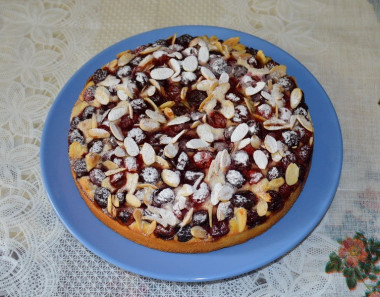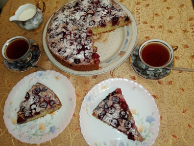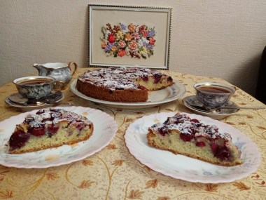 Люблю пироги с вишней. Недавно готовила пирог с вишней в мультиварке, но захотелось попробовать что-то ещё, и я нашла на моем любимом сайте этот рецепт. По составу ингредиентов он почти такой же, но здесь предусмотрены ещё миндальное орешки, и печется он в духовке. Я люблю орехи в выпечке, но миндальных у меня не было и я положила грецкие, а также уменьшила количество яиц до 2-х и сахара до 100 гр., т.к. не люблю привкус яиц и приторные пироги, но это мои предпочтения. В итоге получился полный восторг: приятная вишневая кислинка, орешки и хрустящая корочка, просто супер! Оказывается, при одном и том же составе продуктов добавление орехов и смена способа выпечки дало такой колоссальный результат. Теперь буду печь вишнёвый пирог только так. Спасибо огромное за рецепт!