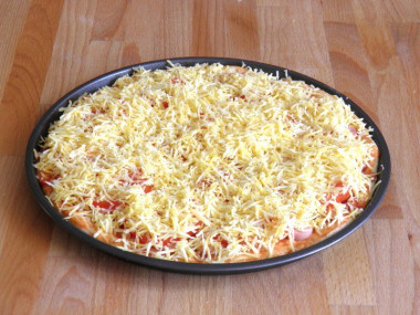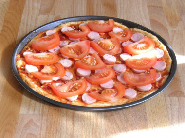 Возьмите противень (или любую другую подходящую форму), смажьте его небольшим количеством растительного масла. Руками растяните тесто в круг, выложив его на противень. Из данного количества теста у меня получилась пицца диаметром 30см. Чтобы основа получилась толстой, оставьте ее постоять в таком виде 10-15 минут. Для тонкого теста продолжайте готовить дальше.