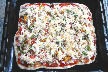 Пеките пиццу 15-20 минут в духовке, разогретой до 200°С. Готовность проверьте, приподняв тесто — оно должно зарумяниться.