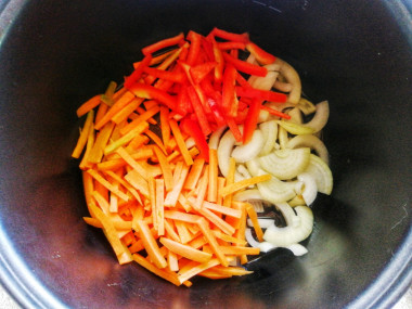 В чашу мультиварки влейте небольшое количество растительного или оливкового масла. Отправьте лук, перец и морковь к маслу. Установите режим "Жарка" и готовьте овощи.