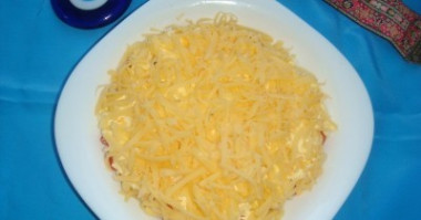 Возможны варианты в рецептуре этого салата: кто-то добавляет в него отварной картофель или маринованные огурцы, кто-то — кукурузу или зеленый горошек и даже чернослив.