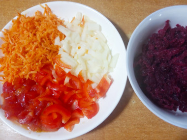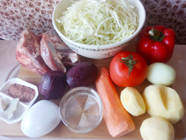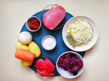Калорийность продуктов: Свинина, Картошка, Морковь, Лук, Свекла, Капуста, Вода, Помидоры, Болгарский перец, Растительное масло, Соль, Специи сухие