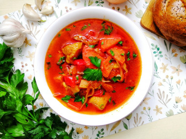 Надо ли говорить, что борщ вышел вкусный! Томатная паста из недавно открытой баночки, очень яркая и насыщенная, передала эти качества борщу, который приобрёл красивый цвет и приятный вкус. Ну и, конечно, сладкие свекла с морковкой и пикантный перец добавили свои нотки. Подавала борщ с майонезом.