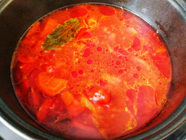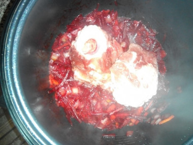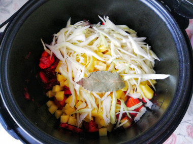 Когда нет времени стоять у плиты очень выручает мультиварка. Сегодня намеревалась сделать борщ и, в надежде сэкономить силы и время, обратилась к этому рецепту. Готовила борщ в мультиварке со свининой. Перво-наперво обжарила мясо в режиме "Жарка". Затем добавила нарезанные овощи - лук, морковь, болгарский перец и свеклу (перец и свекла к меня были замороженные). Положила также томатную пасту, которую взяла вместо помидоров. Перемешала всё и оставила жариться в том же режиме. Минут через 10 положила в чашу картошку, капусту и лавровый лист. Посолила всё и залила горячей водой. Далее готовила борщ в режиме "Тушение" около 1 часа.