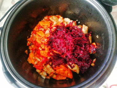 Следом добавьте тертую свеклу. Все перемешайте и обжаривайте овощи с мясом еще минут 15.