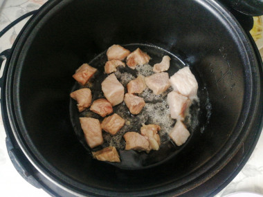 Включите мультиварку на режим "Жарка" и налейте в чашу немного растительного масла. Нарежьте мясо на небольшие кусочки. Выложите мясо в горячую чашу и обжаривайте 12-15 минут, чтобы оно начало поджариваться.
