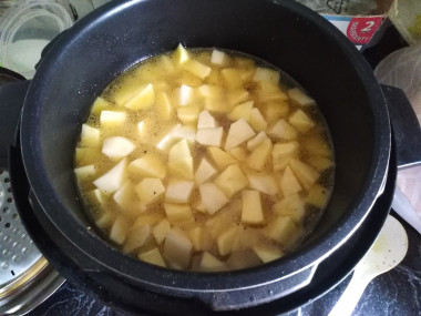 Выкладываем в мультиварку картофель, заливаем всё водой, закрываем крышку мультиварки. Готовим наше блюдо в течение 50 минут на том же режиме. Готовое блюдо можно украсить свежей зеленью. Приятного аппетита!