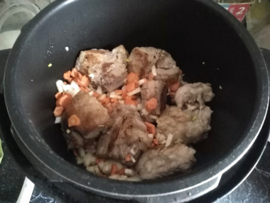 Вливаем в чашу мультиварки немного растительного масла и обжариваем на нём ребрышки в течение 20-25 минут в режиме "Выпечка".