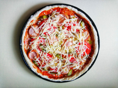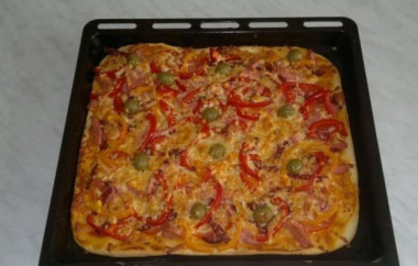 Захотела испечь пиццу и вспомнила об этом рецепте. Решила сделать пиццу без дрожжей на молоке в духовке, ведь времени на ее приготовление требуется не очень много.