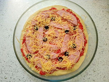 На выходных мы устроили день пиццы. Дочка попросила приготовить, а ведь действительно давно мы себя не баловали этой вкусной выпечкой) Сделала сразу несколько видов. Одной из них стала пицца на толстом тесте в духовке. Мне вообще нравятся все виды теста, и тонкое и толстое. Но "американский" вариант всегда сытнее) Для этой пиццы тесто я замесила точно следуя рецепту, только когда вымешивала добавила еще ложку муки. Тесто получилось пышным, приятным в работе. Я его не раскатывала, а размяла руками, толщина получилась внушительная, даже забеспокоилась, что не пропечется. Но оно прекрасно пропеклось, внутри тесто очень пористое, воздушное, мягкое. Самый краешек, который без начинки немного хрустит. Для начинки взяла вареную колбасу хорошего качества. Оливки у меня были чёрные, но у нас их не очень любят, поэтому добавила немного колечек. Сыр взяла маасдам, он хорошо плавится и вкусный. Получилась очень пышная, сочная и вкусная пицца. Муж сказал, что это пирог) А дети съели её в первую очередь.