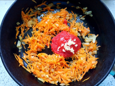 В сковороде разогрейте рафинированное растительное масло. Обжарьте лук и морковку до появления золотистого оттенка. Отправьте томатную пасту к зажарке.