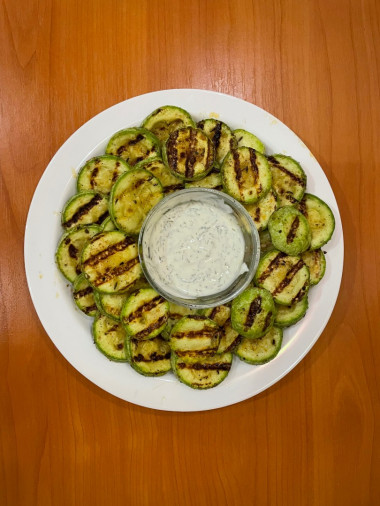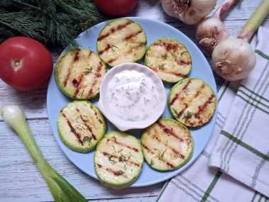 Кабачок я предварительно помыла, обсушила и нарезала на шайбочки вместе со шкуркой, кабачки молодые и шкурка у них тоже вкусная. Ломтики присыпала солью и смесью ароматных перцев из мельнички. Сковородку смазала маслом при помощи силиконовой кисточки, чтобы выступающие полоски тоже промазались. За счёт этого кабачки получились полосатыми. Как я поняла, за процессом нужно внимательно следить, чтобы кабачки успели приобрести рисунок, но при этом не стали слишком мягкими. У меня готовые кружочки слегка хрустели. Кабачки очень вкусные, нежные, приятно похрустывают! А с чесночным соусом вообще огонь! Спасибо за рецепт!