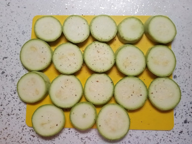 Поставьте разогреваться гриль и в это время нарезанные кабачки посолите и поперчите по вкусу. Чтобы специи лучше держались на кусочках кабачка, аккуратно похлопайте по ним сверху ладонью или пальцами. Переверните кусочки и повторите процедуру с солью и перцем еще раз. Делайте все быстро, чтобы кабачки не успели дать свой сок.