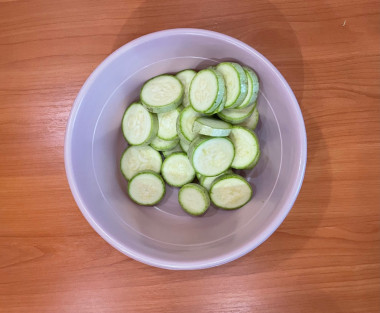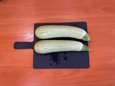 Чистый кабачок нарежьте на кружочки / продолговатые куски толщиной 0,5-0,7 сантиметра. Не нарезайте слишком толсто овощ, он может не приготовиться внутри, но и слишком тонко тоже не нарезайте, так как он может потерять форму.