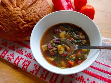 Фасоли у меня оставалось всего 170 гр, всю её и добавила в суп. Не было у меня только щавеля. Бульон, как и предложено в рецепте, варила на говядине.