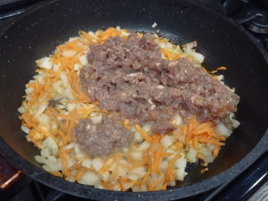 В банке с тушёнкой обычно сверху всегда присутствует застывший жир. Он и будет использоваться для обжаривания овощей. Если жира нет или совсем мало, то используйте 2 столовые ложки растительного масла. Жир соберите с помощью ложки и отправьте в сковородку.