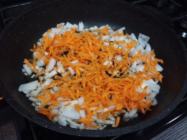 Добавьте туда же лук и морковку. Отправьте обжариваться овощи на сильный огонь. Не забывайте непрерывно всё перемешивать, иначе есть риск того, что лук с морковкой пригорят. На обжаривание у меня ушло около одной минуты.