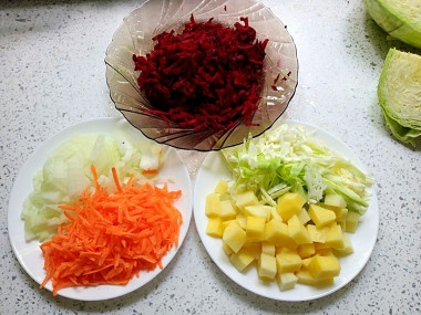 Картофель, лук, морковь, свёклу и чеснок очистите от кожуры. Овощи ополосните под проточной холодной водой и обсушите бумажными салфетками. Картофеля возьмите чуть больше или меньше, как и капусты, в зависимости от того, какой густоты вам нравятся первые блюда. Нарежьте картофель брусочками, кубиками или произвольно, как вам более привычно.