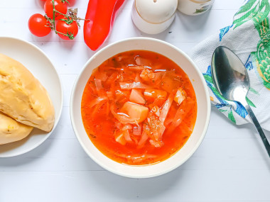 Борщ с тушенкой я еще не готовила. Вообще для меня приготовление борща это целый процесс, интересный и долгий. Но я даже не догадывалась, что можно использовать уже подготовленное мясо, так ведь гораздо быстрее получается вкусный горячий обед! Промышленной тушении у меня не было, зато была говядина кусочками, которую я на кануне долго тушила в мультиварке. Хотела смешать её с макаронами. Но второе блюдо отложилось на потом, зато получился прекрасный борщ быстрого приготовления. Все овощи у меня были нового урожая, из них вдвойне приятнее варить зелье под названием "борщ") Все делала по рецепту, зажарку готовила параллельно отвариванию картошки и капусты. Поэтому все получилось быстро. Томатную пасту заменила домашним кетчупом, в нём уже есть сахар, поэтому в борщ я добавила только чайную ложку сахара. А еще в томате содержится кислота, которая сохраняет насыщенный цвет. Чеснок тоже свежий, аромат от него потрясающе аппетитный! Мясо добавила в кастрюлю вместе с зажаркой. Борщ получился чудесным, он очень вкусный, сытный, насыщенный разными вкусами и ароматами.
