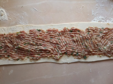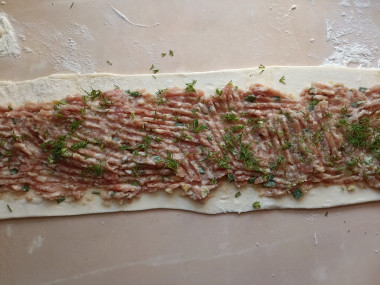 Раскатываем потоньше В ОДНОМ НАПРАВЛЕНИИ, чтобы не нарушить структуру теста. Тогда оно поднимется и пропечется. Выкладываем четвертую часть фарша, распределяем ровным слоем. Сверху посыпаем рубленым укропом.