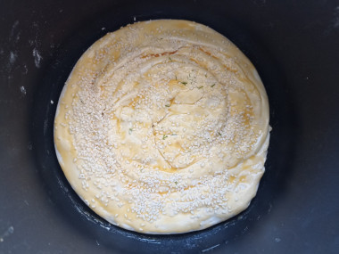 Смазываем желтком и посыпаем кунжутом. Включаем мультиварку на режим Мультиповар, 130 градусов, на сорок минут. После этого пирог переворачиваем и подрумяниваем с другой стороны на режиме Мультиповар, 140 градусов, в течение десяти минут.