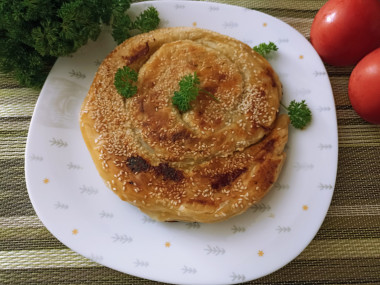 Затем нарезаем на порции и подаем к столу. За счте большого количества зелени в начинке, пирог получается очень сочным. Желающие могут дополнить порцию пирога сметаной. Приятного аппетита!