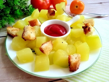 Оказалось, что вареные кабачки очень даже вкусные, особенно, если макать их в кетчуп! Жареные сухарики отлично дополняют нежные кабачки своим ярким вкусом!