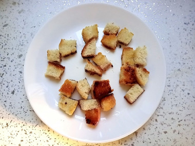 Для получения сухариков обжарила кусочки батона в растительном масле и чуть присолила.