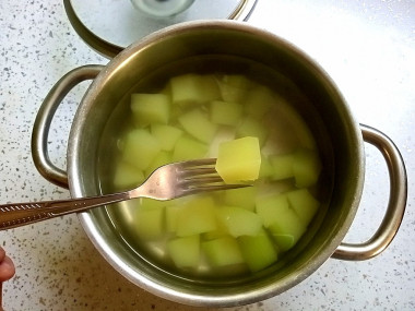 Вскипятите в кастрюле воду, подсолите, перемешайте и выложите нарезанные кабачки. Воду используйте очищенную, так как водопроводная вода может придать готовому блюду неприятный привкус. Варите кабачки на среднем огне 10 минут под закрытой крышкой. Как выбрать кастрюлю читайте в отдельной статье в конце этого рецепта.