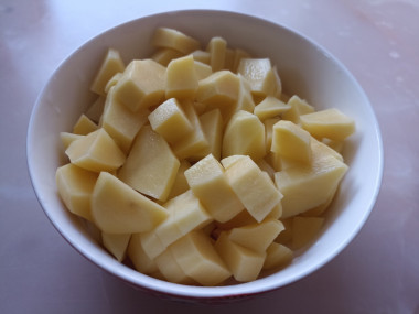 Курицу ставим варится в кипящую подсоленную воду. Картофель нарезаем небольшими кусочками. Когда курица будет готова, добавляем к ней картофель.