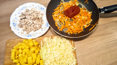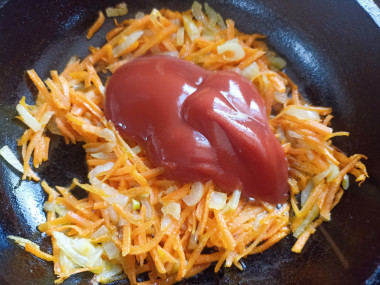Затем к поджарке добавляем томатную пасту и жарим ещё две минуты.