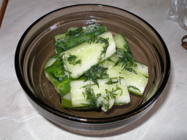 Моя семья очень любит малосольные огурцы, но вот, когда захотелось открыть очередную баночку, огурцов не оказалось. На помощь пришел рецепт быстрых маринованных огурцов в пакете. Купила огурцы, укроп. Все промыла, огурцы нарезала на 4 части, укроп мелко порезала. Сложила огурцы в пакет и добавила укроп. Чеснок нарезала колечками и добавила к огурцам. Влила растительное масло и уксус, добавила соль, сахар. Закрыла пакет и все тщательно перемешала. Убрала в холодильник на 10 минут. Долго ждать не стали и огурцы уже дали немного сока и пропитались ароматом чеснока. Вкусно и быстро! Обязательно буду готовить еще по этому рецепту.