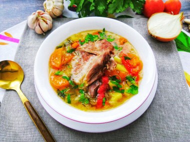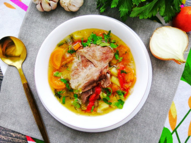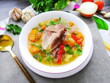 Ребрышки, картошку, лавровый лист и соль положила через полчаса. А через 1,5 часа супчик был готов. Последним штрихом стало добавление в суп чеснока и зелени. Чеснок я натерла на средней терке, из зелени взяла замороженный укроп. Получилось так ароматно! Укроп вышел совсем как свежий, ну очень аппетитный! А суп фантастически вкусный! Очень его украсила природная сладость моркови. А насыщенный вкус он получил благодаря болгарскому перцу.