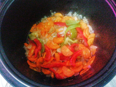 Сегодня, сделав гороховый суп по этому рецепту, ещё раз убедилась в том, что супы в мультиварке получаются очень вкусные! Вместо копчёных рёбрышек взяла свежие свиные ребра. Горох перед варкой замочила на один час. Все овощи нарезала и первым делом обжарила лук и морковь. Затем добавила болгарский перец (у меня был замороженный - зелёный и красный). Обжаривала овощи в режиме "Выпечка", так как накал в нём не такой сильный, можно сказать, щадящий, овощи медленно жарятся и не пригорают (отошла здесь от рецепта, в котором предусмотрен режим "Жарка").