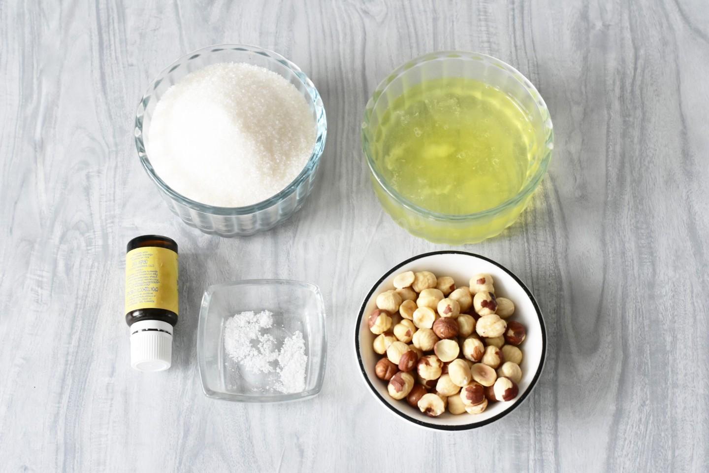 Подготовьте ингредиенты для коржей из безе. Состарьте белки. Для этого отделите от желтков с вечера и оставьте белки при комнатной температуре. Поставьте духовку на разогрев до 100℃. Если используете необжаренный фундук, обжарьте его до лёгкой золотистости на сухой сковороде. О выборе сковороды читайте по ссылке ниже. Если у вас в духовке нет места для выпекания двух коржей, то белковое тесто придется готовить сначала для одного коржа, потом для другого