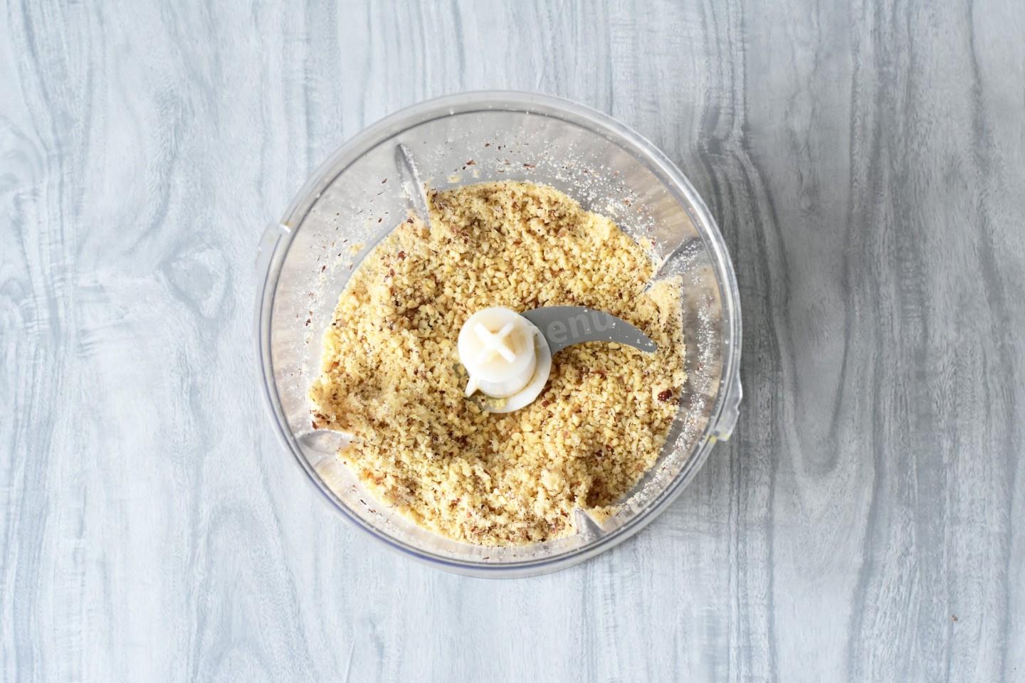 Обжаренный фундук измельчите в блендере пульсирующими короткими включениями по 2-3 секунды до образования мелкой рассыпчатой крошки. Между циклами встряхивайте чашу для равномерного помола. Важно не передержать орехи — при длительном измельчении они начнут выделять масло и превратятся в пасту. Для разнообразия можно использовать микс орехов (например, фундук с арахиcом 50/50), который следует предварительно обжарить и полностью охладить.