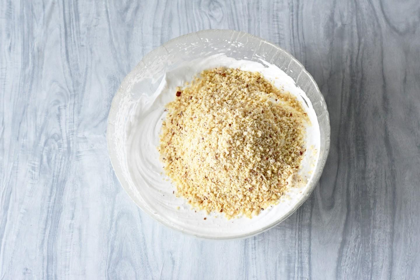 Вмешивайте орехи в белки движениями снизу вверх, чтобы максимально сохранить воздух.