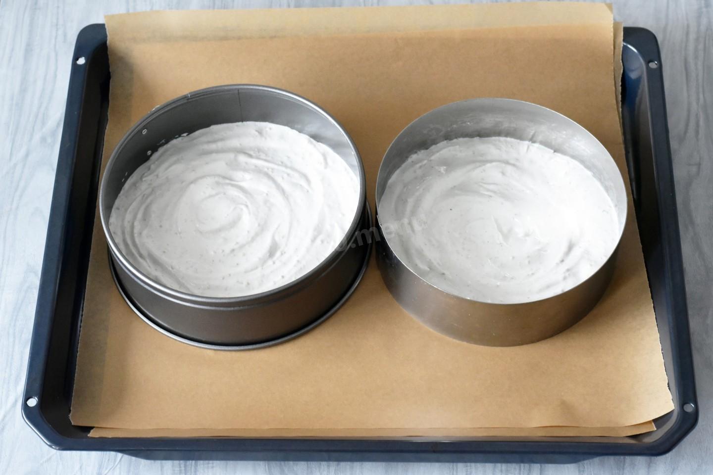 Разделите массу на 2 равные части и выложите в застеленные пергаментом формы для выпечки (Ø 22 см). Выпекайте коржи в разогретой до 100℃ духовке около 1,5-2 часов до полного высыхания. Время и температура указаны приблизительно. Узнать о формах для выпечки и об особенностях работы духовок можно в материалах по ссылкам в конце рецепта.