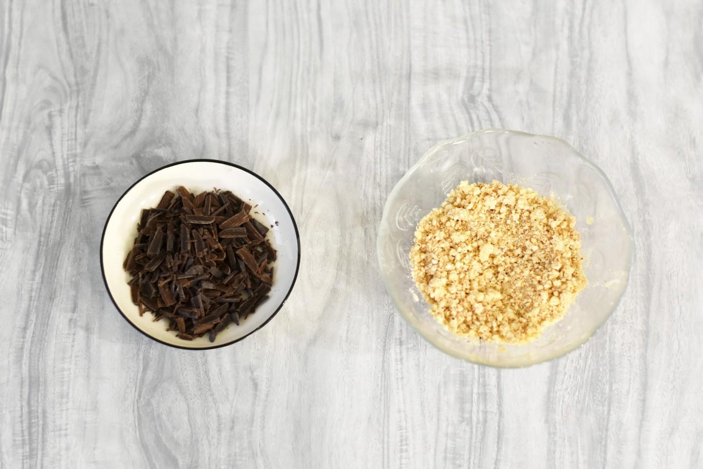 Обрезки от коржей измельчите в блендере пульсирующими движениями до состояния мелкой однородной крошки. Шоколад порубите острым ножом на кусочки. Для удобства слегка подморозьте шоколадную плитку 10-15 минут перед нарезкой. Полученные крошки и шоколадную смесь храните раздельно до момента оформления торта.