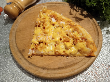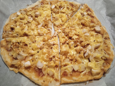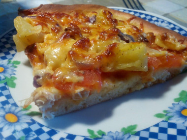 Пицца с ананасами и курицей гавайская - это одна из самых вкусных пицц! Увидела рецепт и захотелось приготовить. Ведь домашняя пицца всегда намного лучше, чем магазинная. Сделала тесто по описанию в рецепте, положила в пакет подходить и занялась начинкой. Отварила куриное филе до готовности. Сделала томатный соус из томатной пасты, разбавив водой, посолила и положила сушёный базилик. Консервированные ананасы нарезала кубиками. От себя ещё добавила репчатого лука, порезав полукольцами. Твердый сыр российский крупно потёрла. Подошедшее тесто тоненько раскатала, смазала соусом и равномерно разложила начинку из отварного куриного филе кубиками, ананасов, лука и присыпала немного приправой для курицы, чтоб ароматнее было. Сверху посыпала сыром и выпекала 12 минут при 320 С. Потрясающе ароматная, вкусная и аппетитная пицца. Кстати, название она своё получила не из-за островов, а потому что раньше называли консервированные ананасы "гавайскими" ))) Великолепный рецепт! Пицца вкусная, сочная и сытная с чуть сладковатым привкусом. Приправки придали аромата пицце. Супер мега вкусно!!! Обязательно забирайте в копилку!!! Благодарю автора 😀