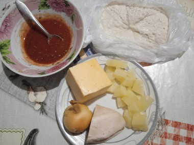 Пока тесто подходит, подготовьте продукты для начинки. Ананасы можно брать любые, кольцами или кусочками - не критично, они все равно нарежутся. Филе предварительно отварите любым способом. Томатный соус подойдет любой. Я взяла обычный краснодарский. Сыр предпочтительней брать тот, который хорошо плавится.