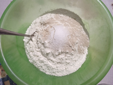 Добавьте к муке все сухие ингредиенты - сахар, соль и сухие дрожжи. Хорошо перемешайте их при помощи вилки.